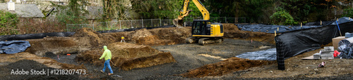 New home construction foundation earthwork, surveyor with laser level range finder, heavy equipment excavator bucket filled with crushed rock gravel to build stable foundation
