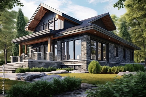 New Innovative Dwelling with Double Garage, Dark Blue Siding, and Natural Stone Porch Design, generative AI