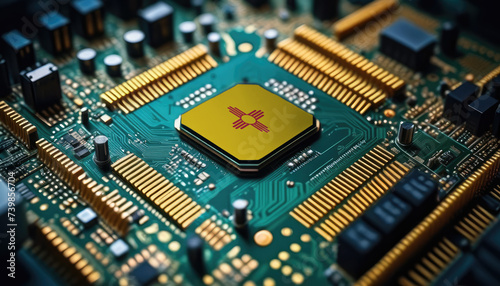 New Mexico flag on a processor, CPU or microchip on a motherboard. Concept for the battle of global microchips production.