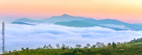 New morning scene on top hill looking down with fog covering valley and peaceful sunrise sky background in Da Lat highland, Vietnam