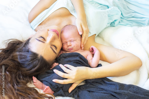 New mother cuddles her newborn baby on soft blanket in cozy indoor setting