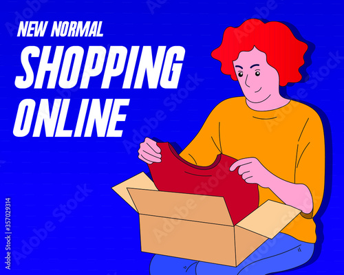 new normal after Coronavirus COVID-19 financial crisis and economy recession concept, The smart young man is opening the box a new shirt and happily with online shopping from home. Selling online