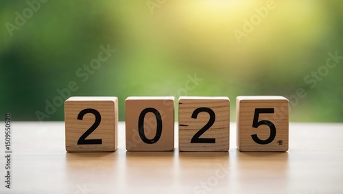 New year concept "2025" with wooden blocks on the table, bokeh effect,