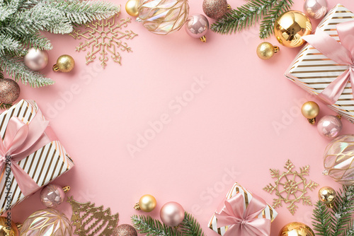 New Year concept. Top view photo of gift boxes with bows pine branches in frost decorated with stylish baubles and snowflake ornaments on isolated pastel pink background with empty space in the middle