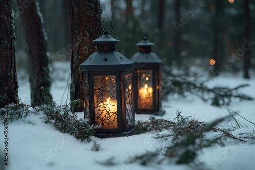 New Year Festive Lanterns in the Forest Isolated on White Background, Depth of Field
