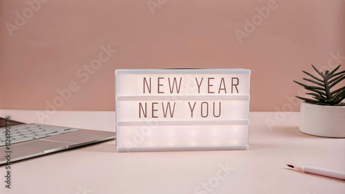 NEW YEAR NEW YOU radiates softly from a white lightbox on a pink desk, accompanied by a laptop, pen, and potted plant
