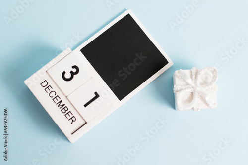New Year, wooden calendar with the date December 31 on a blue background with decor, flatlay. The concept of preparing for the celebration of Christmas and New Year and plans for the future.
