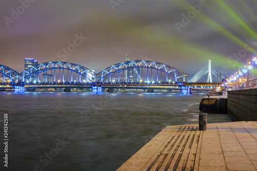 New Year's evening with colorful fireworks in Riga over river Daugava. Railroad bridge with colorful reflections from fireworks.