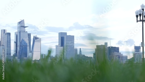 New York City waterfront skyline, Manhattan Midtown Hudson Yards buildings, riverfront skyscrapers. Waterside cityscape from Pier A Park, Hoboken, New Jersey. United States architecture, grass lawn.