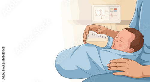 Newborn baby is feeding from a bottle held by parent, an illustration with copy space