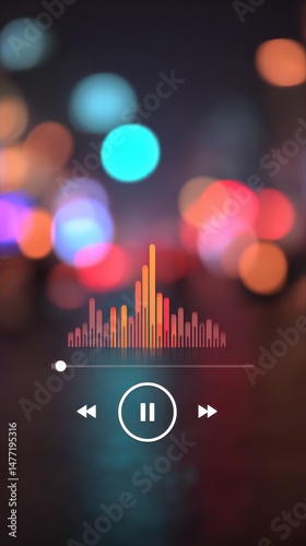 Night City Bokeh Background with Music Player Interface Audio Visualizer Displaying Paused Music
