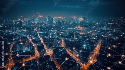 Night City Skyline Network. Aerial view of illuminated city streets connected by glowing network lines. Use for technology, innovation, or urban design