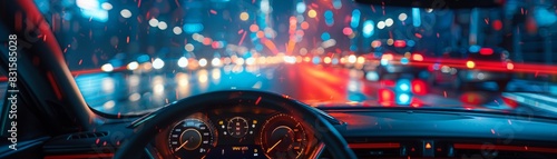 Night cityscape from inside a car, with vibrant lights and rainy streets creating a dynamic and colorful atmosphere.