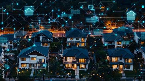 Night Cityscape View of Connected Residential Houses Showing Digital Network Infrastructure