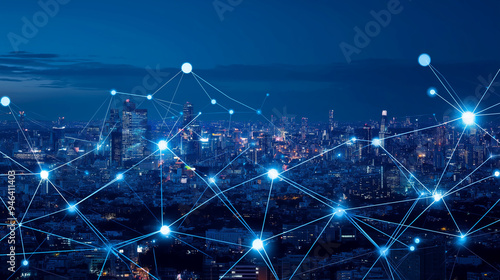 Night cityscape with glowing network connections, symbolizing digital connectivity..
