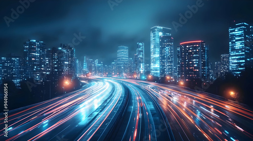 Night Cityscape With Highway Traffic Lights And Skyscrapers