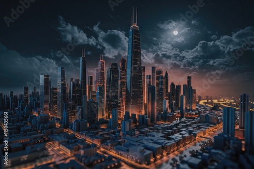Night cityscape with skyscrapers illuminated under a full moon and cloudy sky.
