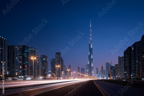 Night cityscape with tall buildings and a highway showing light trails from moving vehicles, modern urban travel concept.