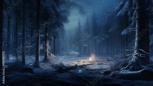 Night in a dark blue forest in winter time. Neural network ai generated art