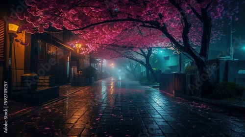 night in the city pink Sophora affinis Eve's Necklace japonica trees in japan