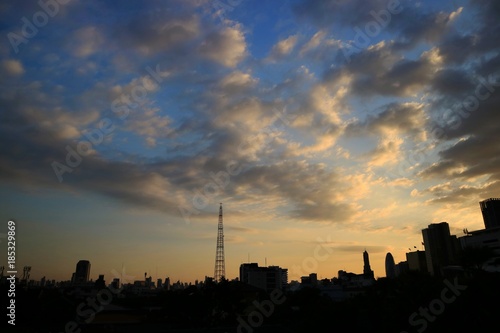 Night is Coming, Sunset Paradise with red and blue sky, cloud and building in big city. Business background concept with copy space, low key.