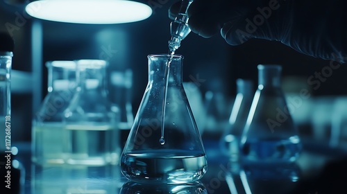 Night Lab Experiment: A Scientist Carefully Adds Liquid to a Flask in a Dark Laboratory Setting