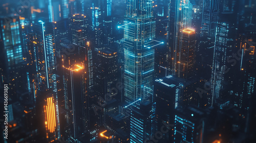 Night lights, a city of modern business and smart digital innovation with a network of interconnected rewards over the cityscape of the future smart wireless digital city and social media network that