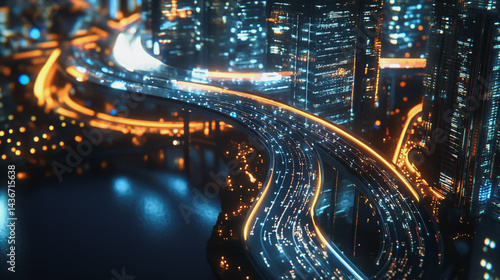 Night lights, a city of modern business and smart digital innovation with a network of interconnected rewards over the cityscape of the future smart wireless digital city and social media network that