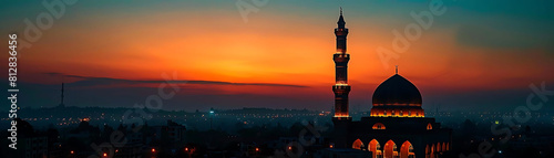 night mosque tower stands tall against an orange sky, illuminated by the warm glow of the sun