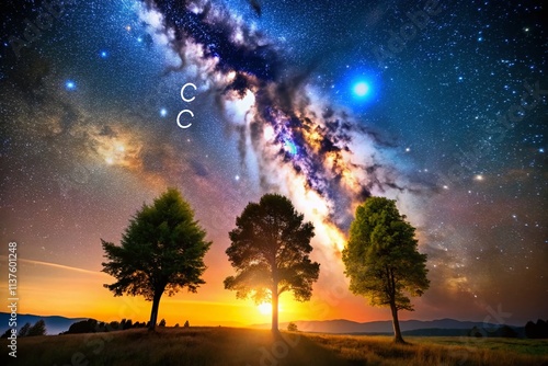 Night Photography of Carbon Isotopes Illustrated in a Stellar Landscape with Glowing Elements Representing C12, C13, and C14 in a Celestial Setting