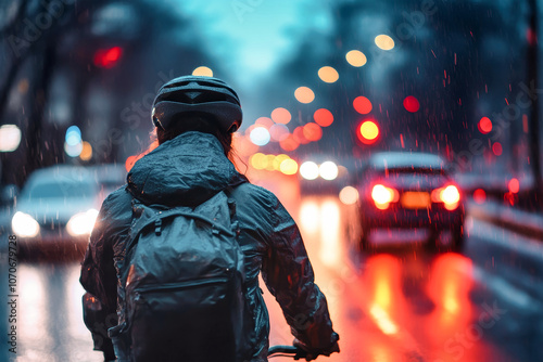 Night ride through rain on a city street with an illuminated cyclist navigating traffic
