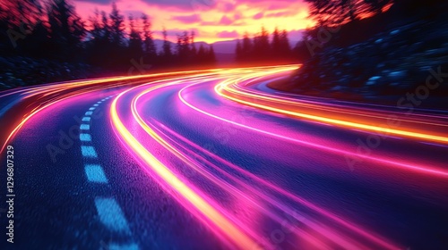 Night Road with Light Trails and Trees at Colorful Sunset Time