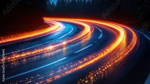 Night road with light trails, curving path, speed, motion blur, forest background.