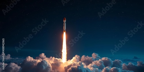 Night rocket launch piercing clouds, starscape backdrop, journey, powerful