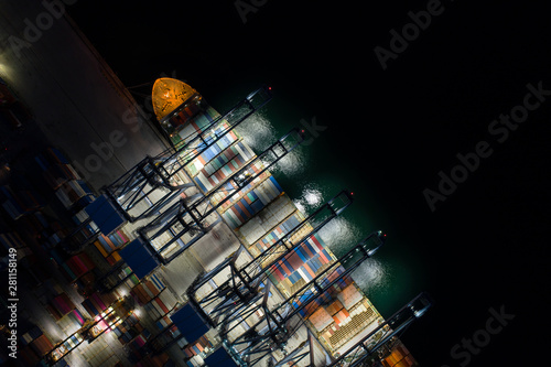 Night scene Aerial view sea port Container cargo loading ship in import export business logistic. Freight transportation. shipping business logistic. Trade Port and Shipping cargo to harbor.