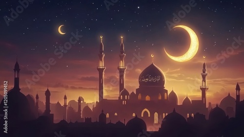 Night Scene of Mosque Cityscape Under Crescent Moons