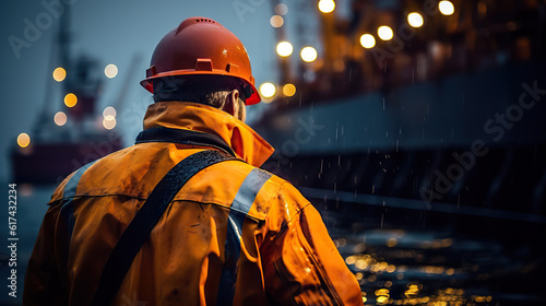 Night Shift Vigilance Industrial Worker Observing Oil Rig Operations in Stormy Weather. created with Generative AI