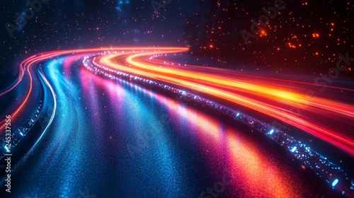 Night Sky and Road Illuminated with Pink and Blue Neon Lights. Generative AI