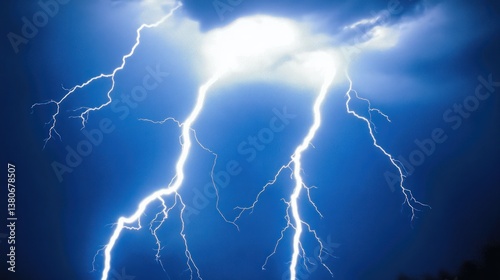 Night sky, powerful lightning strikes, dark clouds, storm, weather, background texture, graphic design