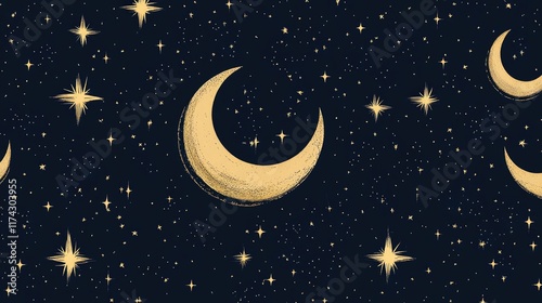 Night Sky with Crescent Moons and Shining Stars against Dark Background