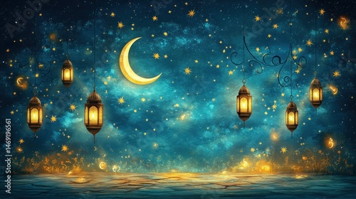 Night sky with lanterns and crescent moon