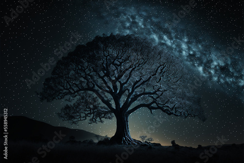 night starry sky between dark tree silhouette. Front view. Generative AI