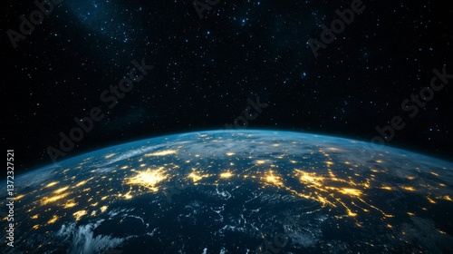 Night view of Earth from space, showing city lights and starlit sky. The image depicts the planet's curvature and the contrast between illuminated urban areas and the darkness of space.