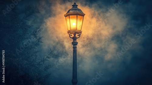Night's Solitude: A Glowing Streetlamp in Misty Darkness