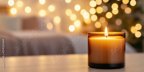 nighttime ambiance, softly burning eco-friendly candle on a bedside table, with a cozy bedroom background and blank space for text