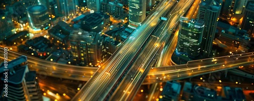 Nighttime Cityscape Illustration with Illuminated Highway Interchanges and Skyscrapers