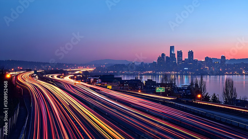 Nighttime Cityscape With Traffic Trails on Highway and Illuminated Skyline