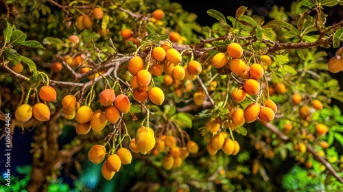 Nighttime fruit tree branches laden with orange-yellow fruits