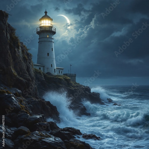 Nighttime lighthouse casting its beacon across a dark ocean, with stormy waves and clouds creating a dramatic and powerful maritime scene
