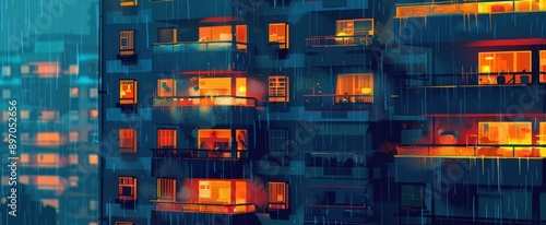 Nighttime Rainfall on Apartment Building with Warm Yellow Lighting